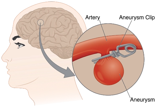 A small opening in your skull or skull base is made to provide access to the brain aneurysm. Micro instruments are used to attach metal clips to seal off the base of the  aneurysm. This stops blood from flowing into the aneurysm and will stop brain bleeding and prevent future rupture of the aneurysm. Recovery time may be a few weeks for unruptured aneurysms with longer times of up to a few months for ruptured aneurysms. Aneurysm surgery is considered curative although aneurysms may recur.